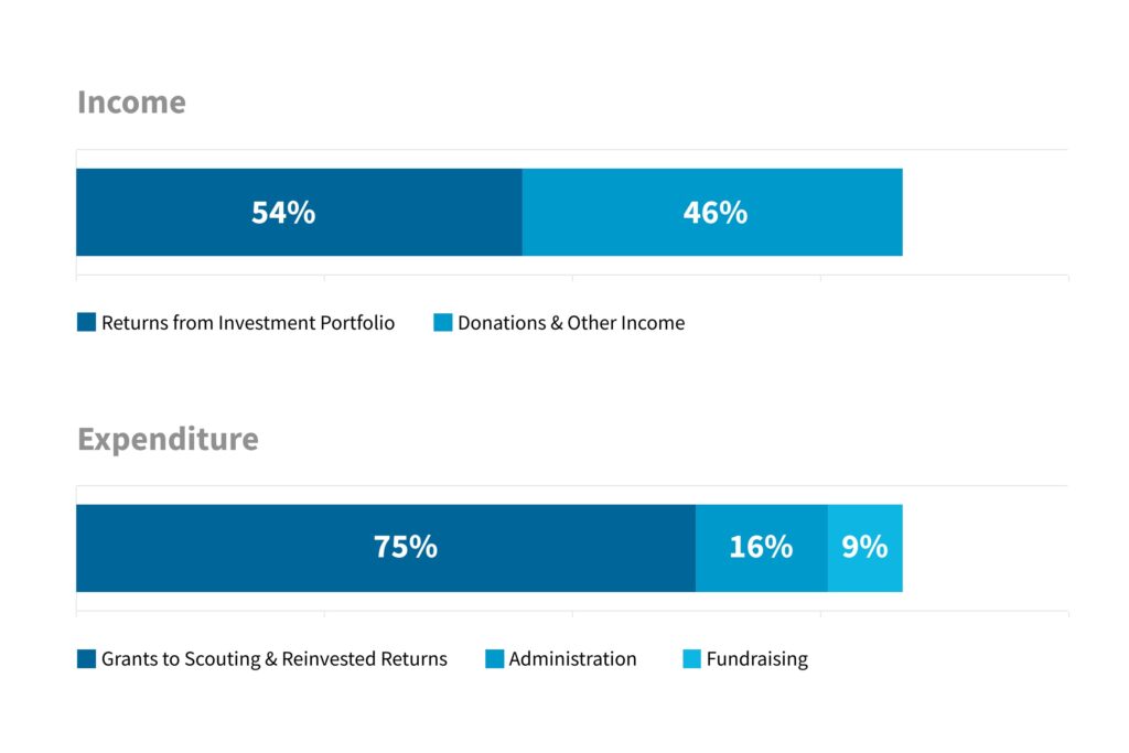 After ensuring that all disbursements and grants to Scouting were made and our own expenses were covered, we were still able to reinvest USD 0.9 million into our Endowment Fund to provide long-term support for Scouting.